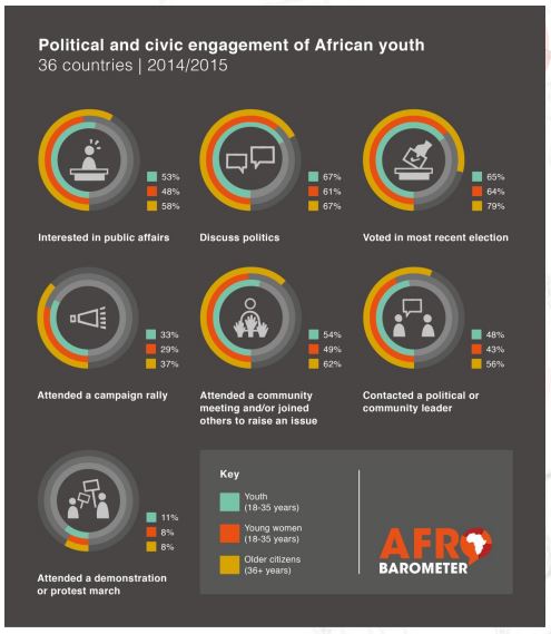 According to a 2016 Afrobarometer study, “political and civic participation amongst African youth is declining and is particularly weak among African women”. African youth (aged 18-35) report lower rates of political participation than their elders across a variety of indicators including voting in national elections. Measures of interest in and discussion of politics differs across the 36 countries that the study covers. It is found that interest levels increase with ” age, education, and material security”. Youth who are fully employed are the most likely to show an interest in public affairs. In terms of electoral participation, specifically voting, it is found that electoral participation decreases with education levels.